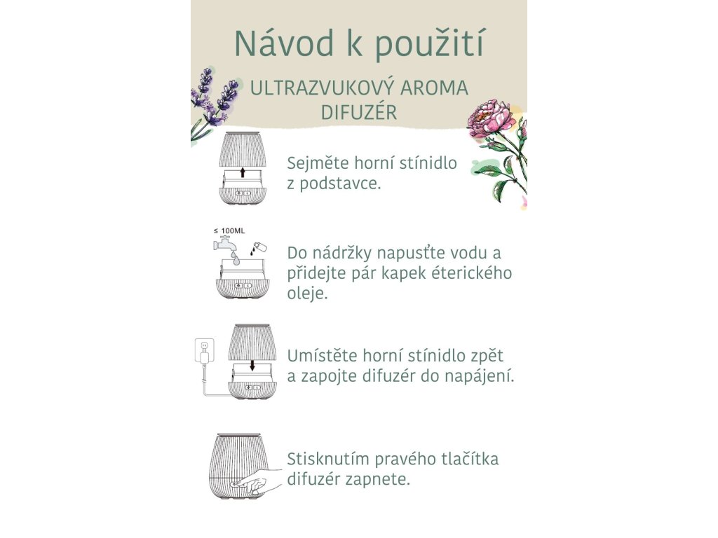 Před prvním použitím si přečtěte návod. Nádobku naplňte vodou po rysku, přidejte 8–10 kapek éterického oleje. Zavřete, zapněte a nastavte režim.
